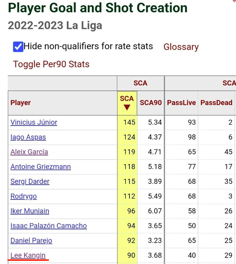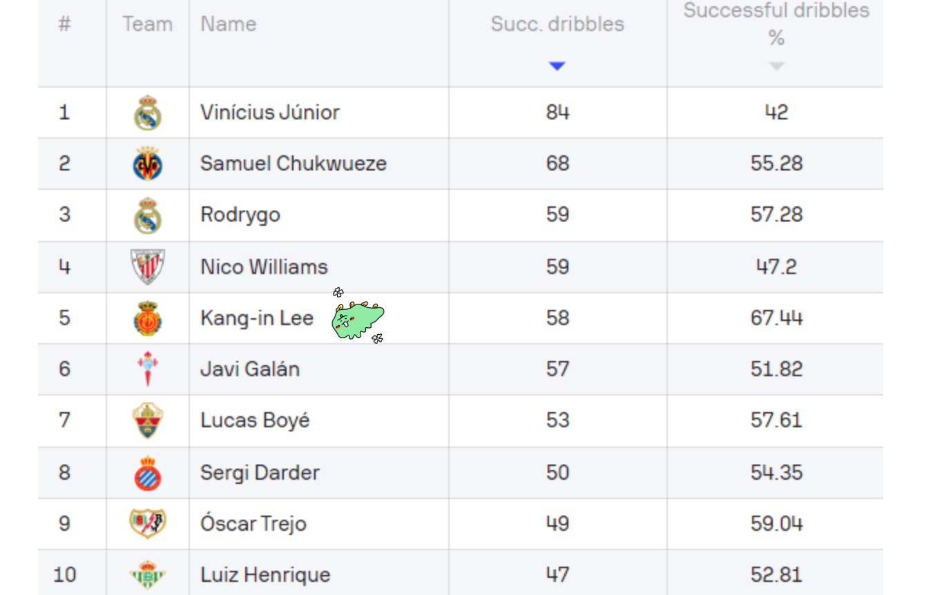 그보다 더 대단한건 공격포인트 10개보다 키패스, 기회창출, 빅찬스생성, 드리블시도 및 성공 등 좋은 스탯지표가 모두 라리가 톱클래스 수준입니다. 마르요카 경기를 보면 이강인 혼자 경기를 다한다고 할 수 있을 정도로 활동량 및 경기에 미치는 영향력이 상당합니다.
