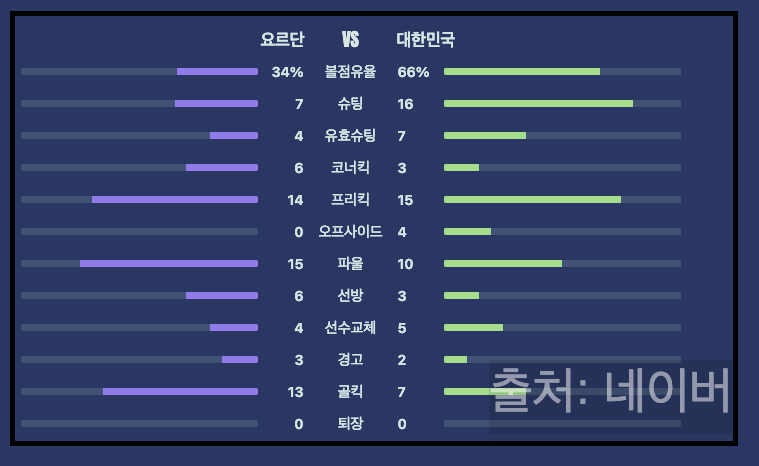 그러나 4강 준결승전 요르단 대한민국 축구 결과는 처참합니다. 볼 점유율은 67%로 압도적이었으나 사실상 좌우로 볼 돌리기에 바빴지 제대로된 공격 전개를 하지 못했습니다. 그 결과 유효슈팅 0이라는 망신스러운 경기지표가 나왔네요. 반대로 요르단은 볼 점유율이 33%밖에 안됐지만 슈팅 12번에 유효슈팅 7번이나 가져가면서 2골을 넣었습니다.